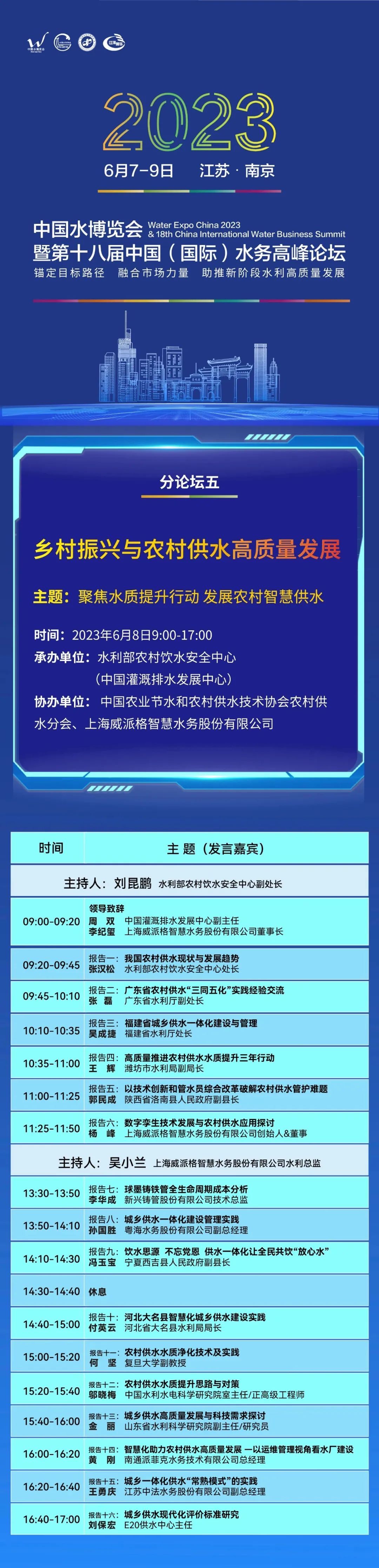 以交流促進(jìn)互通,以合作推動共贏,上海威派格智慧水務(wù)股份有限公司作為本次大會的協(xié)辦單位將在6月8日與中國農(nóng)業(yè)節(jié)水和農(nóng)村供水技術(shù)協(xié)會農(nóng)村供水分會共同協(xié)助舉辦由水利部農(nóng)村飲水安全中心(中國灌溉排水排水發(fā)展中心)承辦的“鄉(xiāng)村振興與農(nóng)村供水高質(zhì)量發(fā)展分論壇“,共同探討”聚焦水質(zhì)提升行動,發(fā)展農(nóng)村智慧供水”話題。
