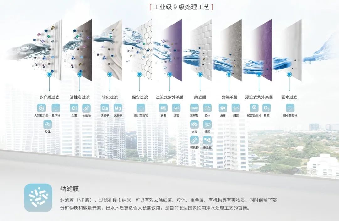 系統(tǒng)采用“多介質(zhì)過濾-活性炭過濾-軟化過濾-保安過濾-過流式紫外殺菌-納濾過濾-臭氧殺菌-浸沒式紫外殺菌-回水過濾”九級處理工藝,去除水中雜質(zhì)、鐵銹、異味、細菌、微生物、重金屬等有害污染物,保證水質(zhì)達到“飲用凈水水質(zhì)標準CJ94-2005”的直飲要求,適合家中飲用、煮飯、洗菜、泡茶等多種需要。