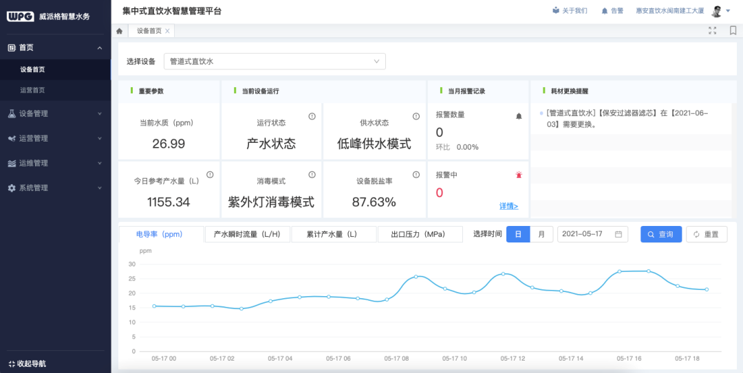 不同于常見的單一設備,威派格直飲水設備集水質(zhì)監(jiān)測、運維管理、遠程監(jiān)控及各部件、耗材的全生命周期管理為一體。威派格提供完善的售后服務運維體系,針對設備原理、操作安全以及日常維護,提供專業(yè)的技術(shù)人員進行培訓,確保出水水質(zhì)長期穩(wěn)定,保證入口的每一滴水都合格健康,同時讓物業(yè)人員運維管理更加高效便捷。