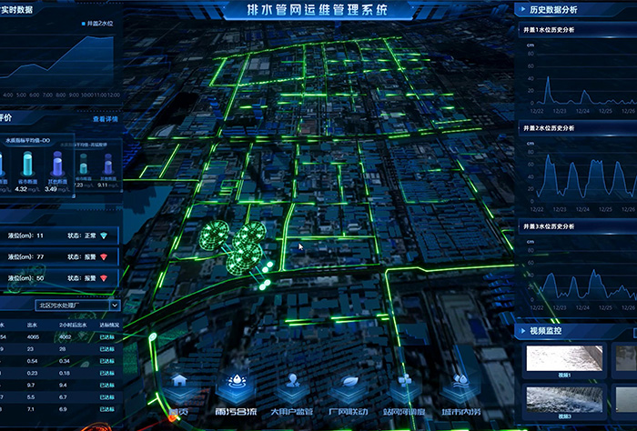 建立二三維可視化管網(wǎng)一張圖,實(shí)現(xiàn)實(shí)時動態(tài)監(jiān)測,并基于大數(shù)據(jù)技術(shù)分析管網(wǎng)缺陷、評估排水運(yùn)行狀態(tài),有效提升城市排水系統(tǒng)的監(jiān)管、處理能力,保證城市排水設(shè)施正常運(yùn)行。